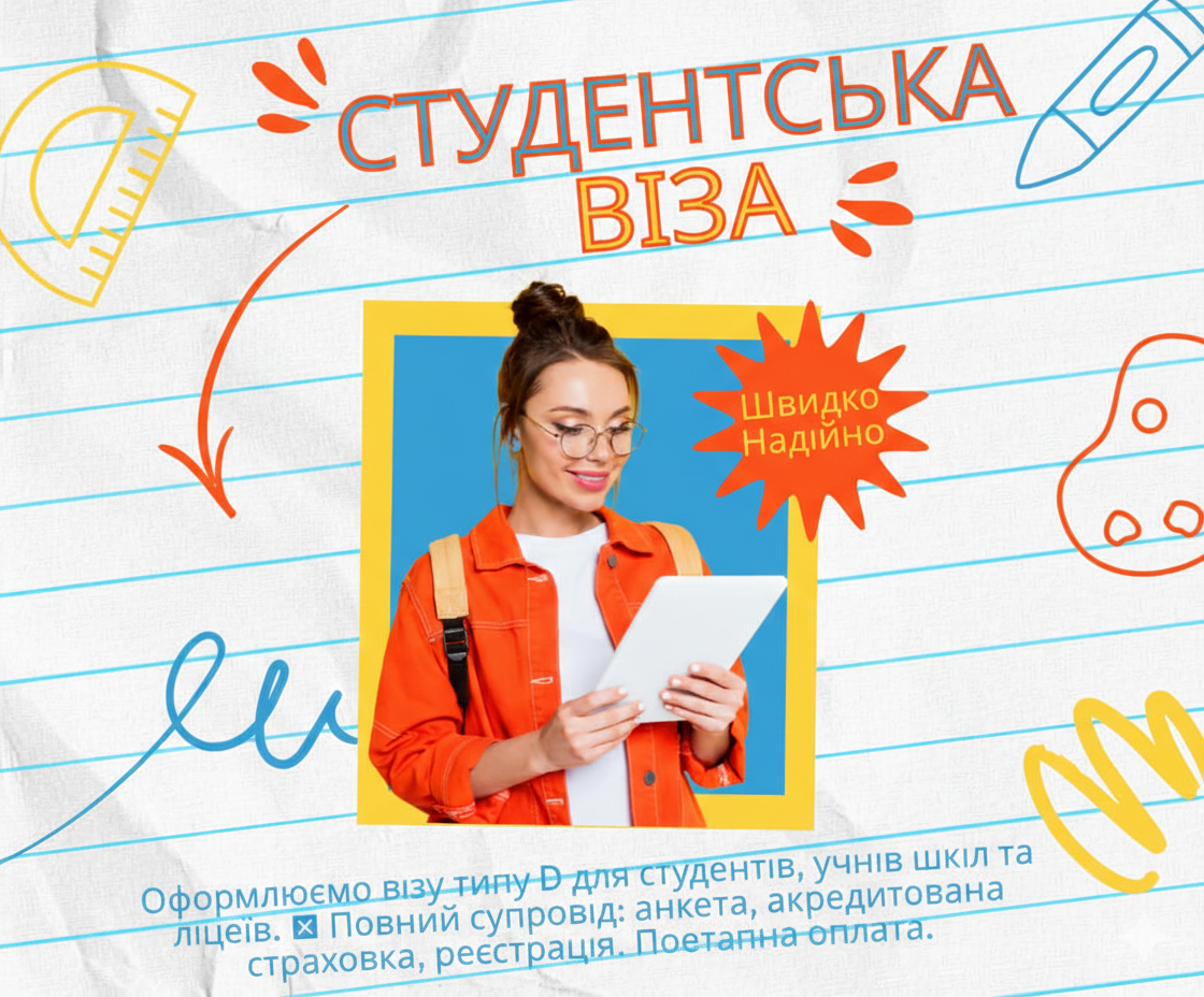 Професійна допомога в оформленні студентської візи (тип D) для навчання в університетах, технікумах та на мовних курсах Польщі. Компанія «ЄВіза» забезпечує повний супровід: правильне заповнення анкети, реєстрацію, акредитоване страхування та подачу документів без вашої присутності. Працюємо офіційно за договором, гарантуючи прозорість та результат. Почніть свій шлях до європейської освіти з надійною підтримкою експертів!