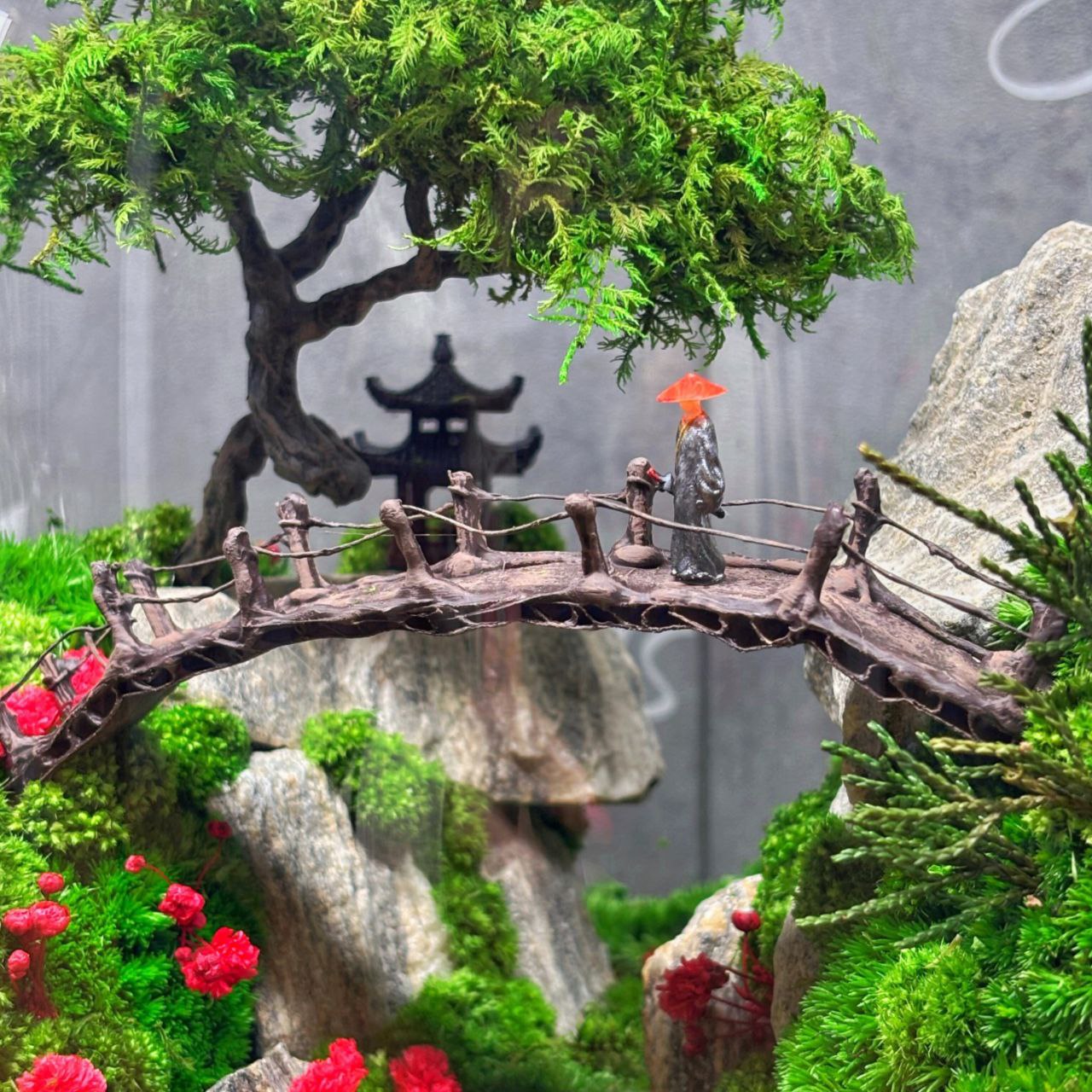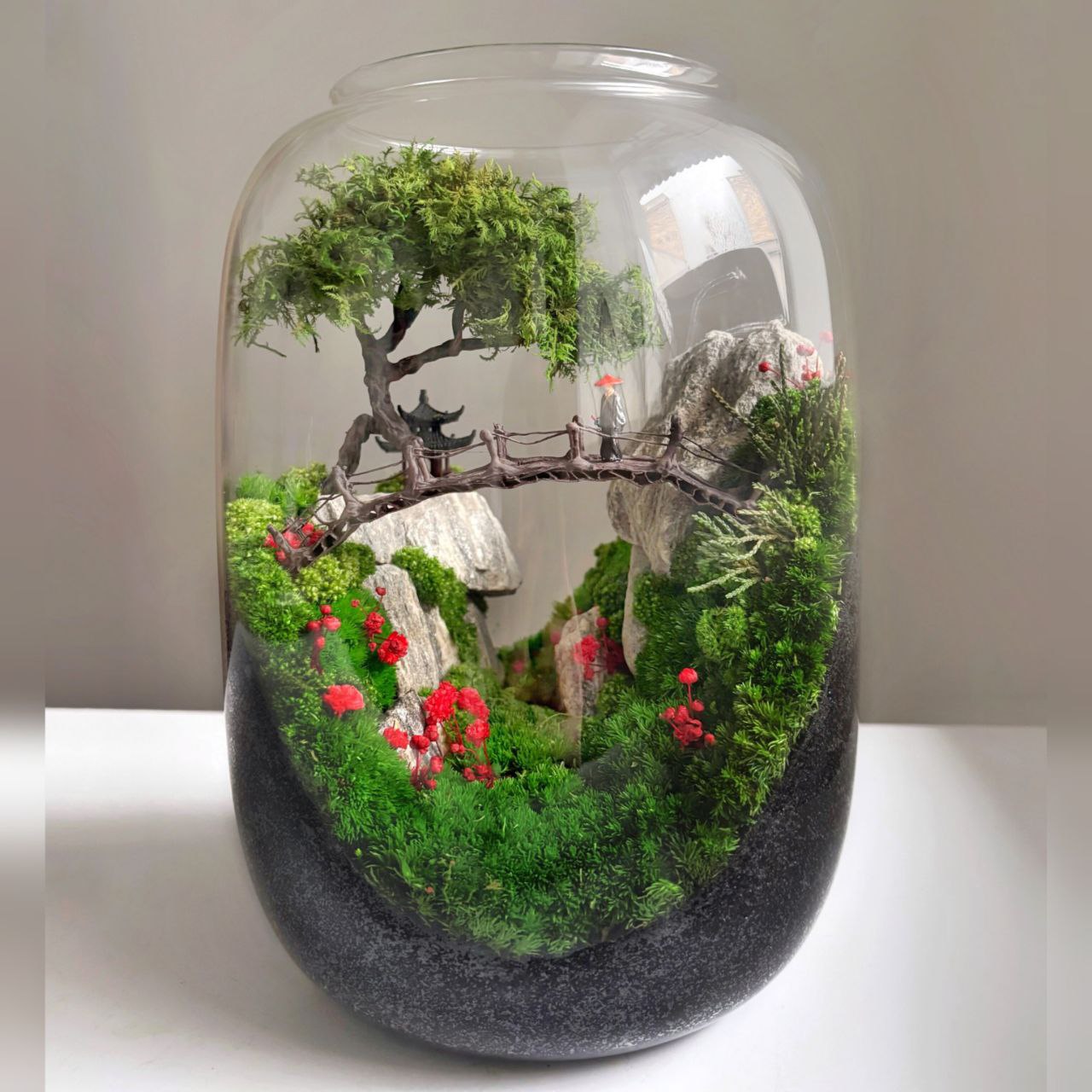 Це унікальна композиція у склі, створена вручну. Усередині — мініатюрний пейзаж із деревом, мостом і горами, виконаний з ювелірною точністю. Композиція не потребує догляду, поливу чи освітлення, при цьому зберігає свіжий природний вигляд протягом 7–10 років. Підсвічування м’яко освітлює композицію в темряві, створюючи атмосферу затишку та магії. Такий мосаріум стане центром уваги в інтер’єрі, офісі або стане особливим елементом подарунка для поціновувачів природи та гармонії.