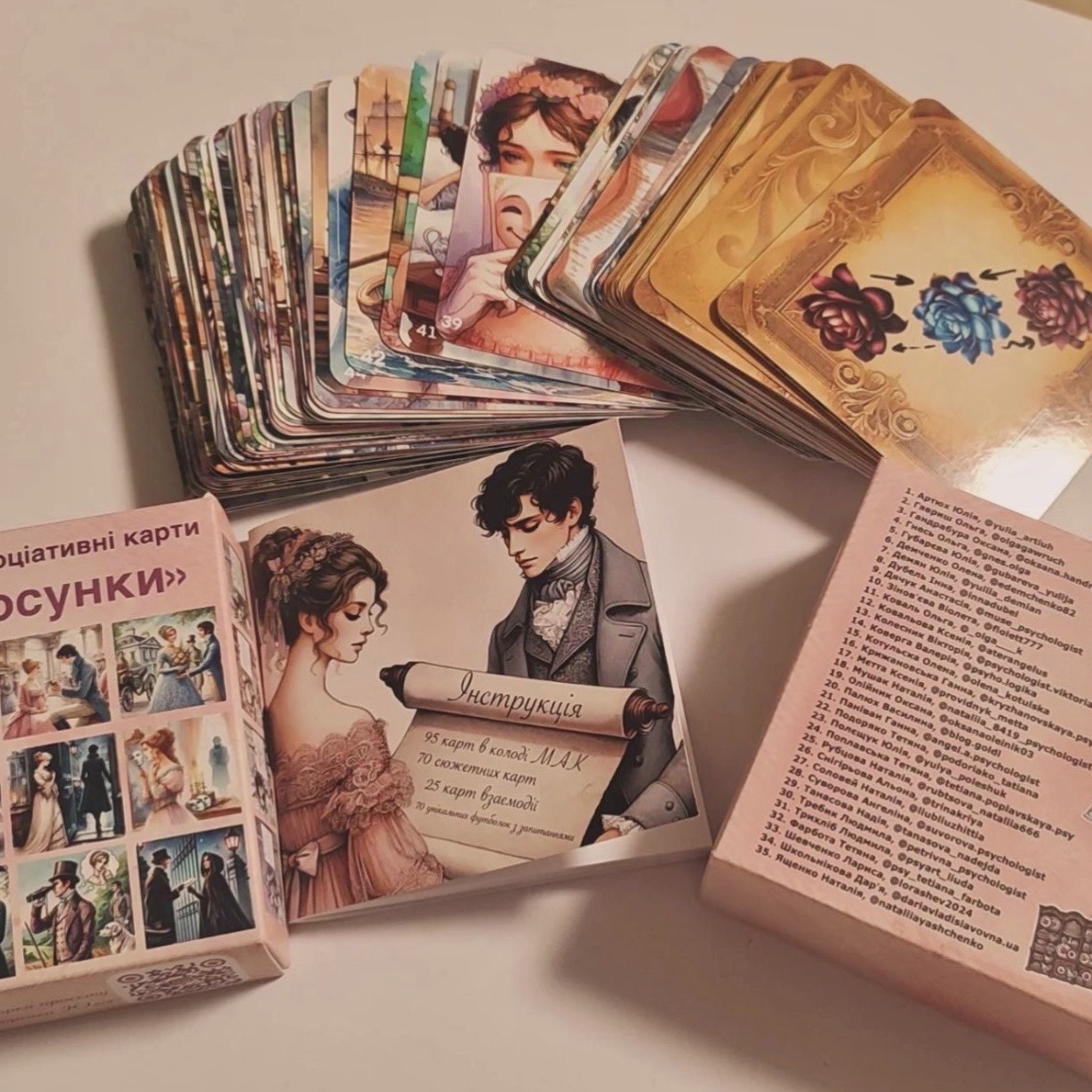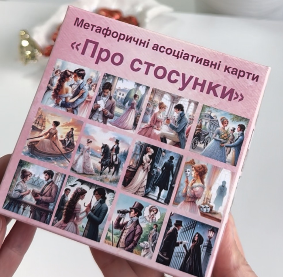 Колода метафоричних зображень МАК «Про стосунки» створена командою психологів на основі реальних запитів клієнтів. Вона допомагає через образи й асоціації побачити те, що важко сформулювати словами, краще зрозуміти себе та партнера і знайти нові рішення. Для особистої роботи. Для пар. Для психологів.